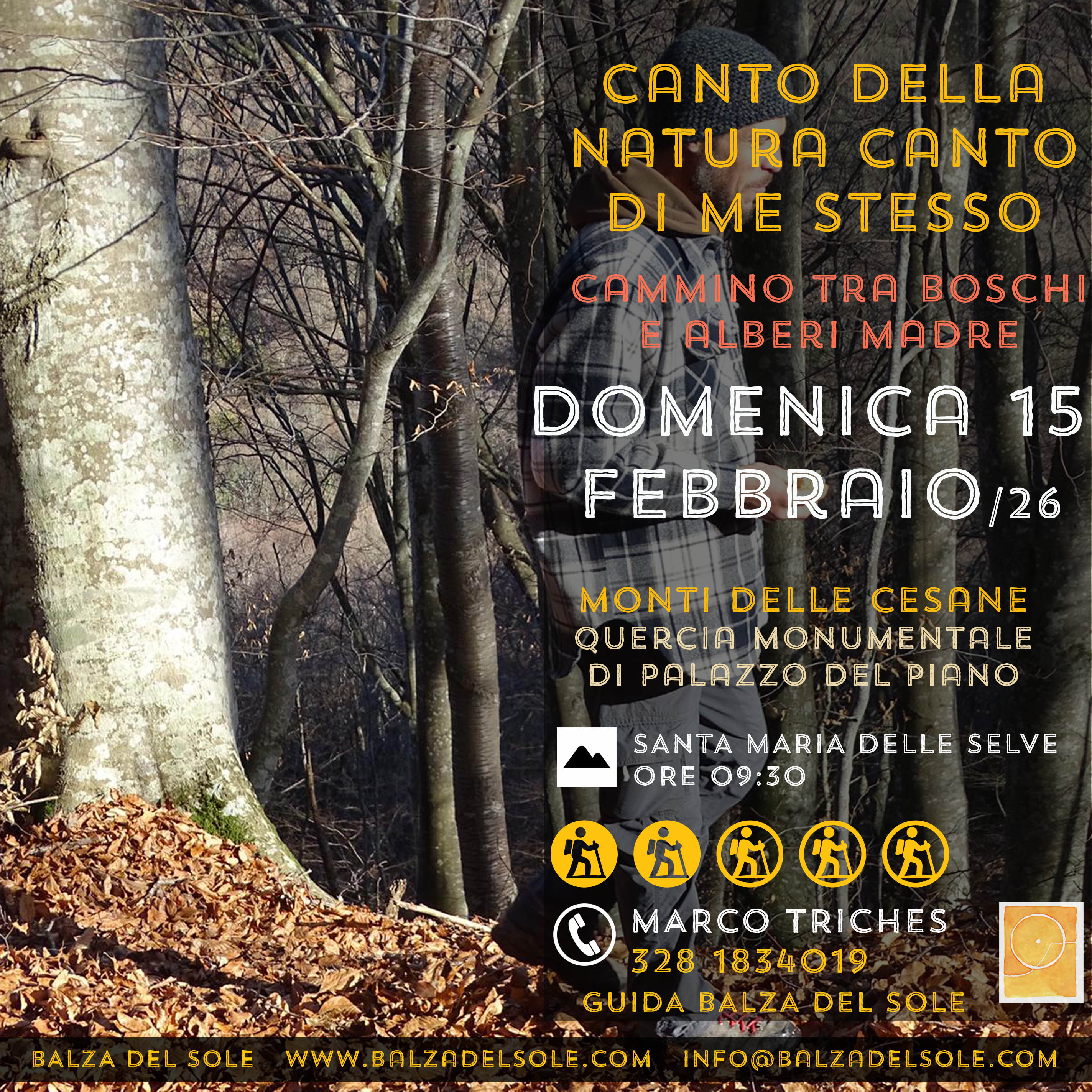 Canto della Natura è un percorso tra i sentieri delle Cesane per andare a conoscere e vedere da vicino la grande quercia monumentale di Palazzo del Piano: un’esmplare unico e simbolico, un vero albero madre. Dai crinali panoramici con incolti e campi aridi e ricoperti di macchia, per le stradine di ghiaia al margine dei campi fino a ruderi, boschi e valli. Un percorso dedicato alla Natura delle nostre campagne appenniniche e a noi stessi. Canto di me stesso ovvero la nostra ombra sulla terra, siamo un’istante, un battito di ciglia.