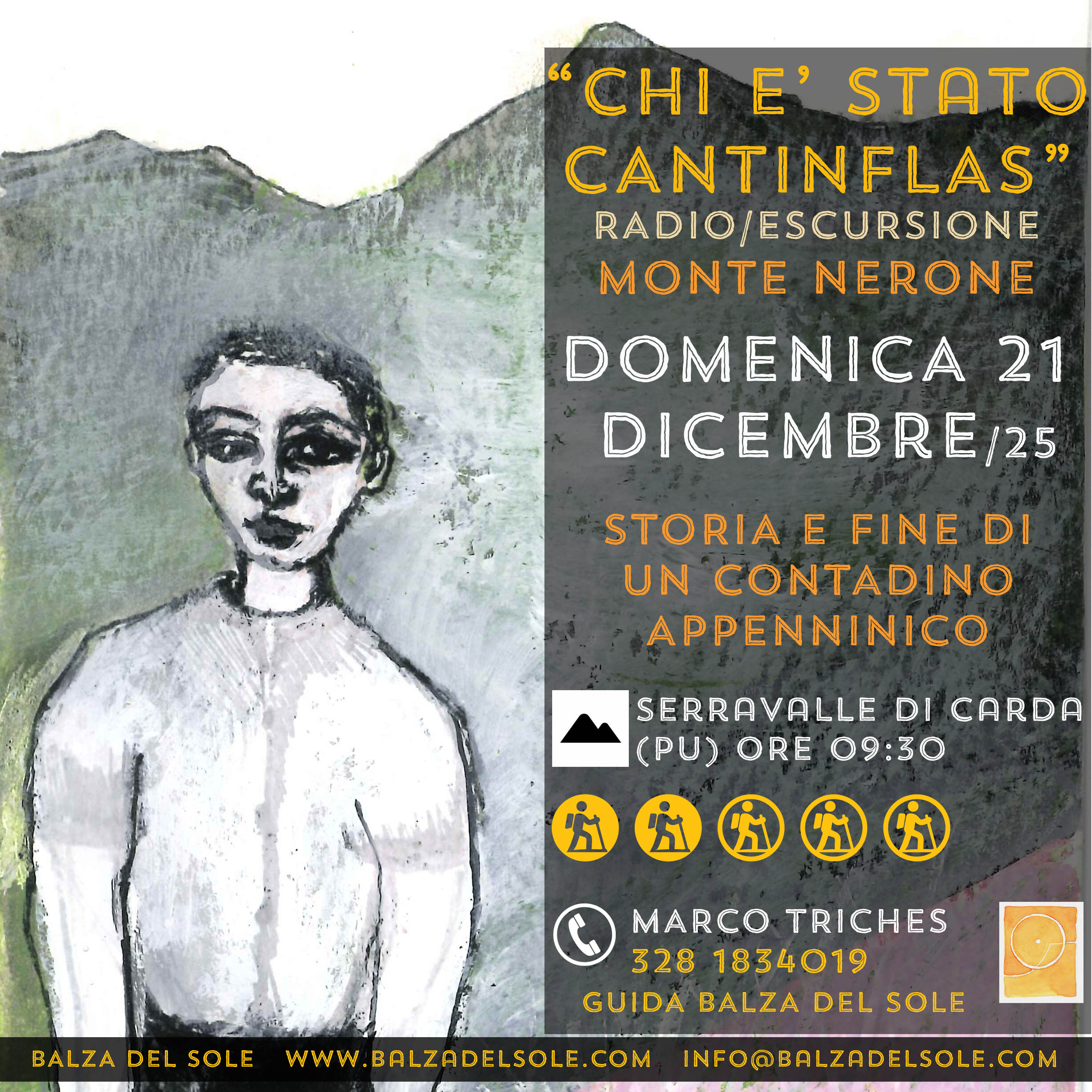 In cammino potremo soffermarci nell’ascolto della natura invernale e del racconto delle vicende di Cantinflas, contadino appenninico. Dalla sua fuga da Montelago e il Monte Strega, al lungo viaggio per Fonte Avellana e il monte Petrano, fino al rifugio di Pieia e il suo abbandono, l’epilogo di una vicenda umana esemplare.
