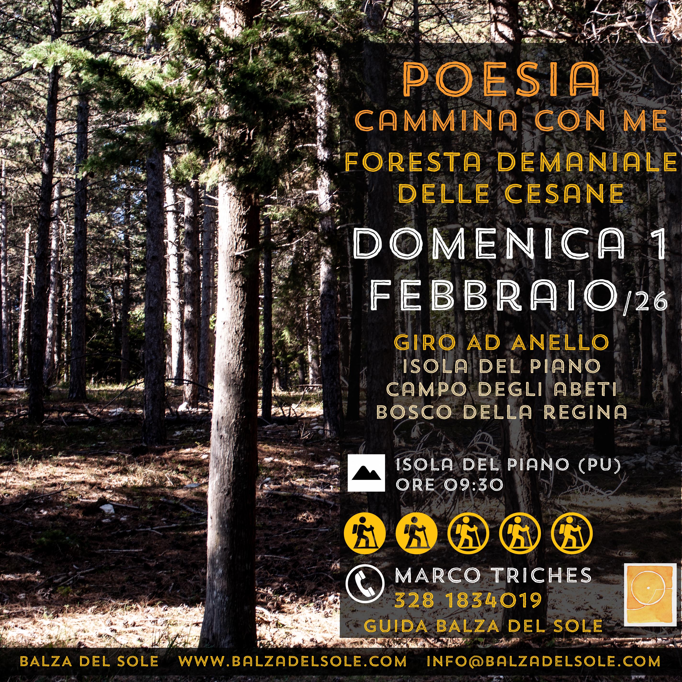 Tra gli strumenti che abbiamo per vivere esperienze significative, sicuramente l’arte e in particolare la poesia ci consentono di trasformare quattro passi, un’escursione, in una Passeggiata. La passeggiata è un viaggio insieme interno ed esterno, una meraviglia. La Natura, il passo e la parola costruiscono luoghi e nuove prospettive. Per questo motivo organizziamo un piccolo viaggio nella foresta demaniale delle Cesane accompagnati da suoni, profumi, colori e alcune poesie dedicate in particolare all’ambiente e alla condizione umana.