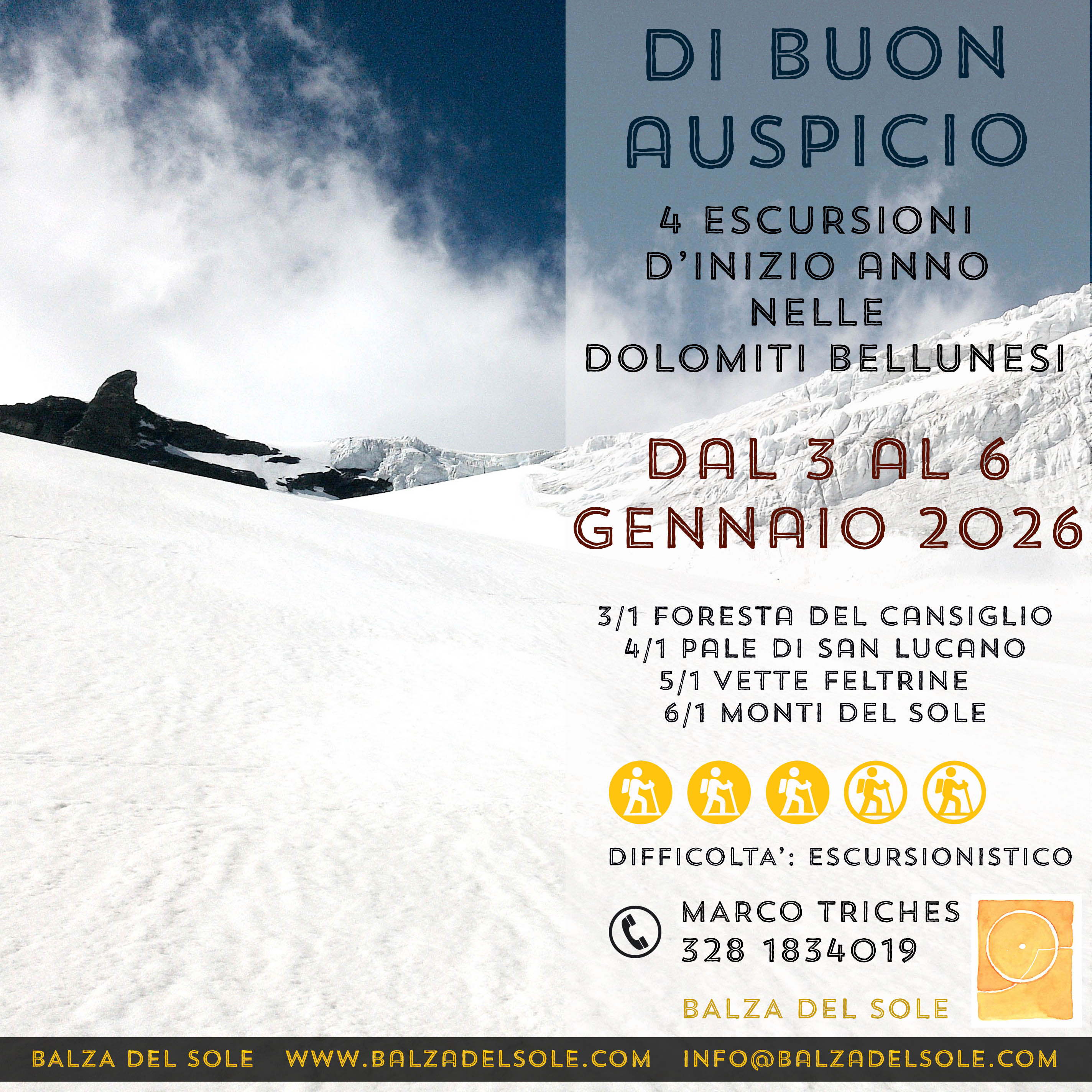 Per l’inizio del 2026 Balza del Sole ha il piacere di invitarvi a Di buon auspicio, una rassegna di escursioni, ambienti e racconti in alcuni dei luoghi più suggestivi delle Dolomiti Bellunesi. Un viaggio (a cui partecipare intergralmente oppure in parte) sulle orme della storia umana e naturalistica del territorio, tra cime innevate, baite e casere rustiche sparse tra radure e boschi, sentieri isolati. Una prospettiva insolita, lontana dal traffico e dalla ressa, su una delle catene montuose più famose al mondo.